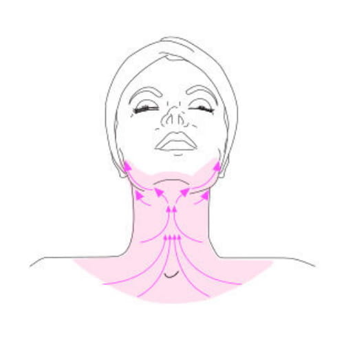 Rozprowadź krem na szyi i dekolcie delikatnymi ruchami ku górze, rozpocznij masaż od linii obojczyków przesuwając się ku górze aż do linii żuchwy.